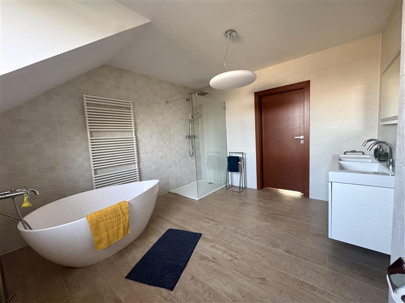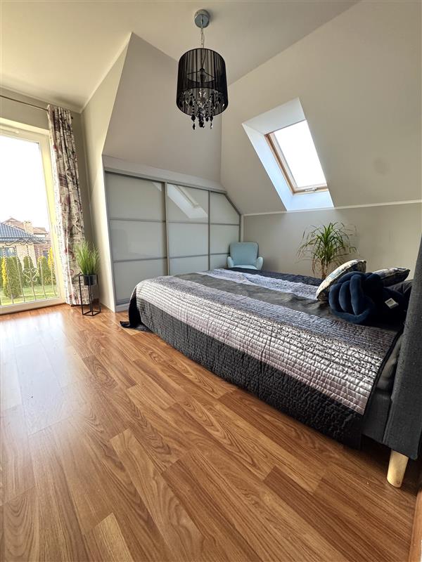 PIęTRO: Składa się z czterech sypialni w tym jedna z garderobą i łazienką, pomieszczenia pełniącego funkcję siłowni z sauną, przestronnej łazienki oraz holu gdzie znajdziemy aneks kuchenny. Hol wyłożony pięknym litym drewnem oferuje dodatkową przestrzeń do spotkań, a aneks kuchenny ułatwia serwowanie tam pysznych dań.