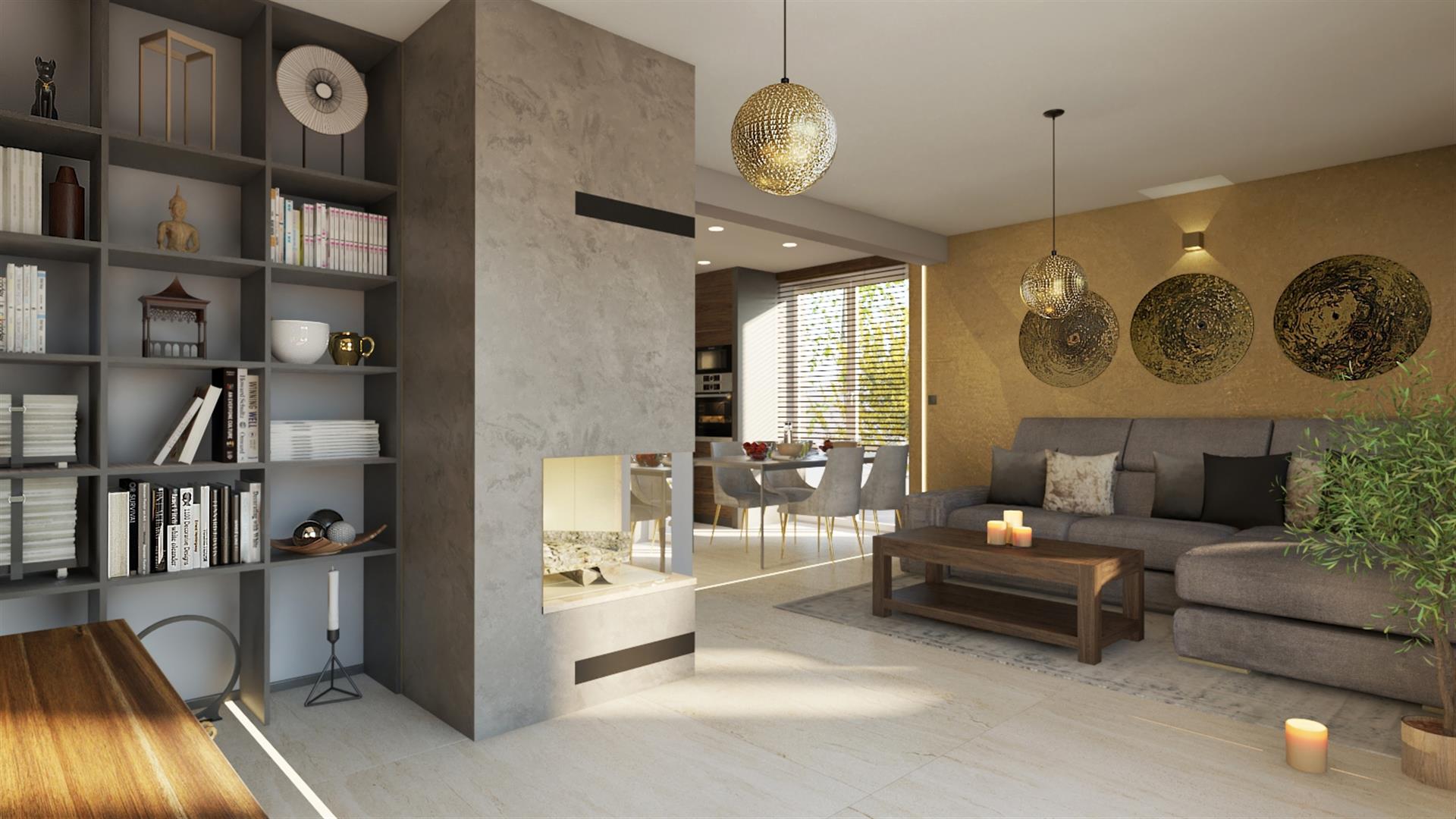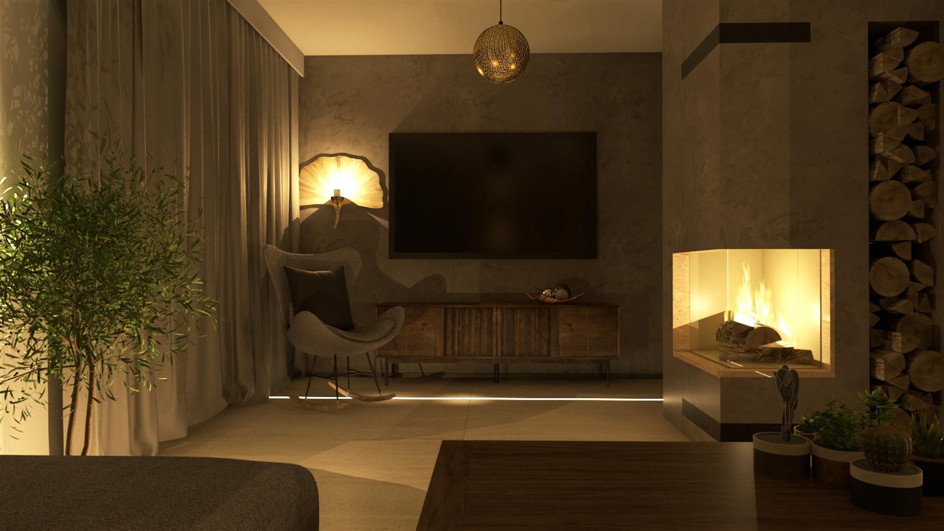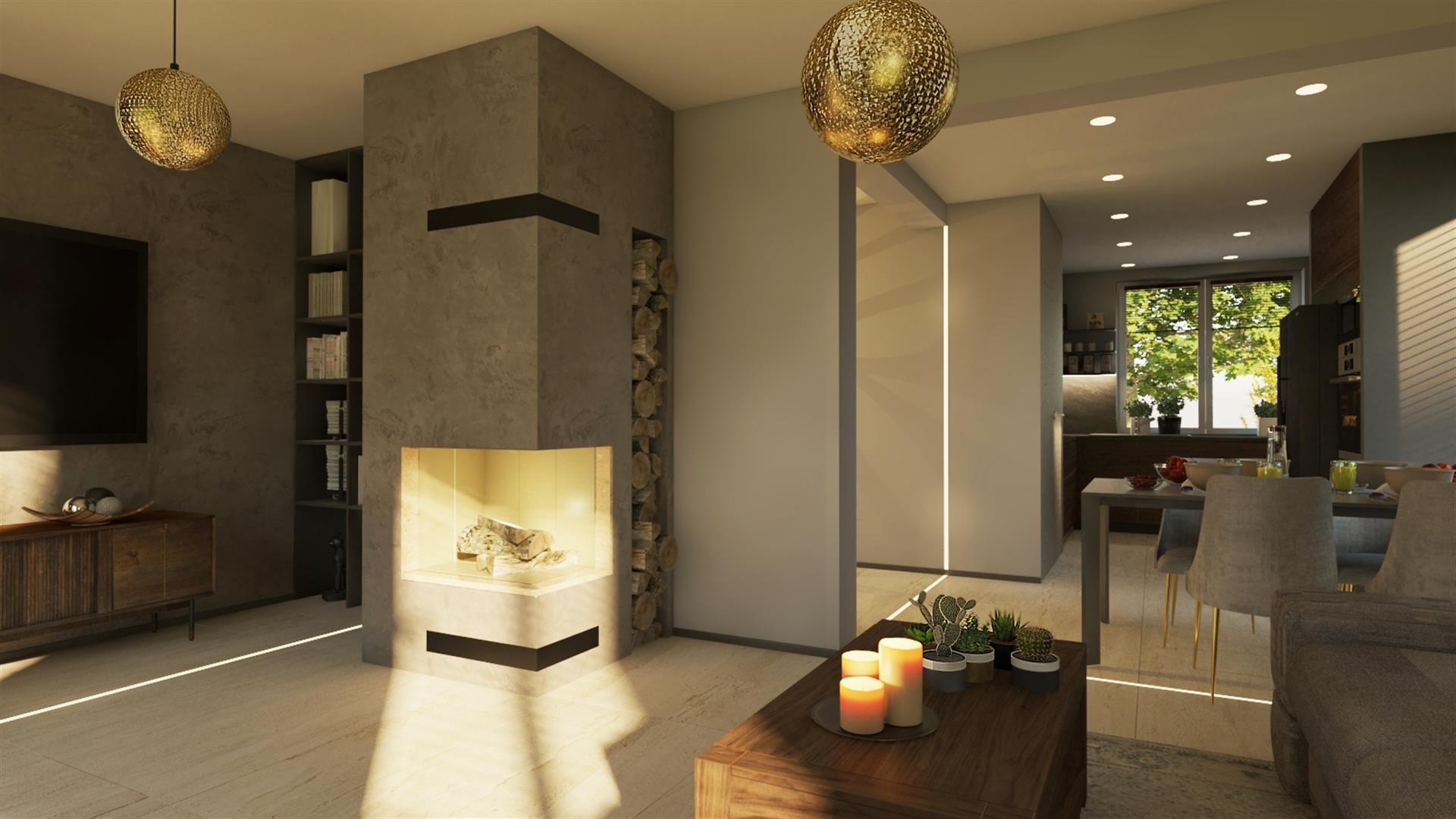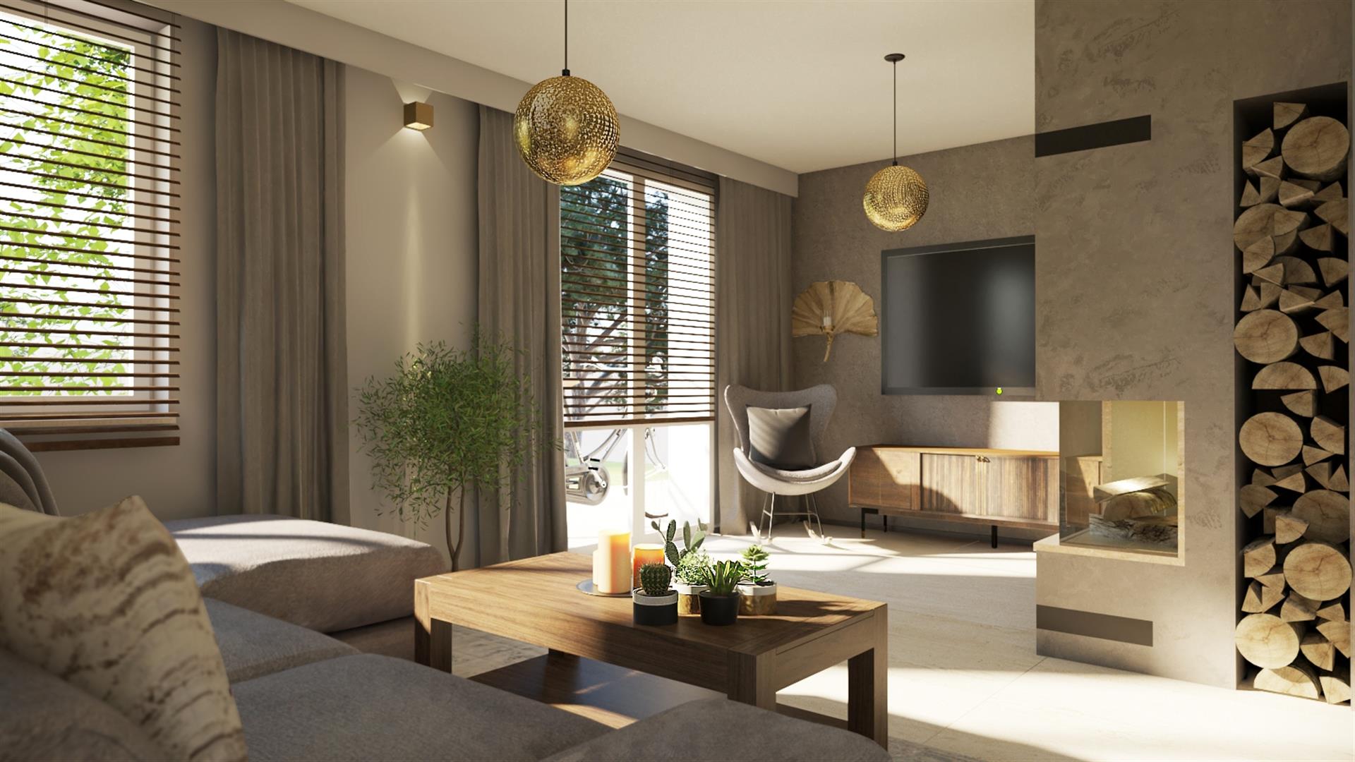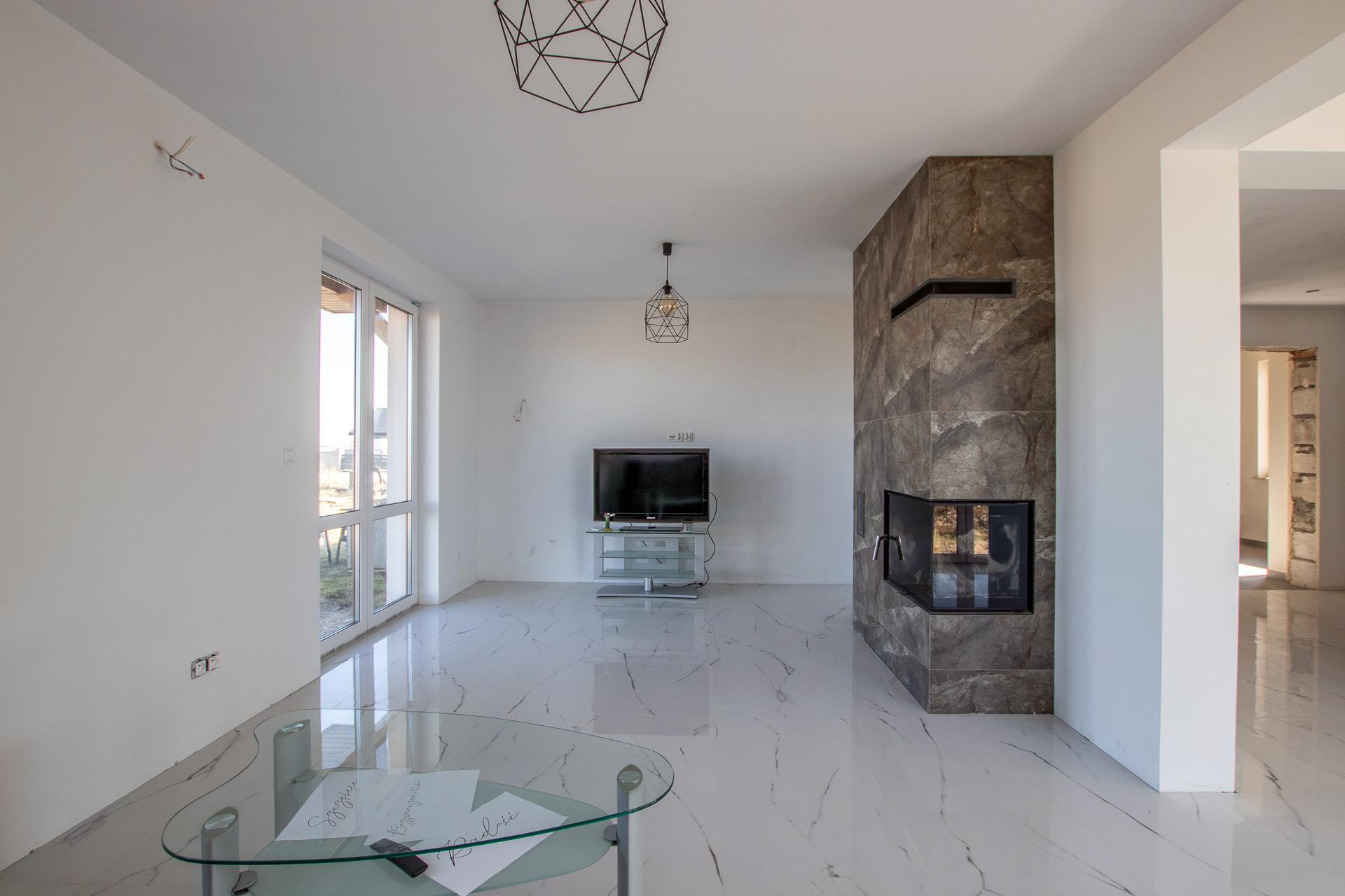 przestronny salon z kominkiem i wyjściem do ogrodu;