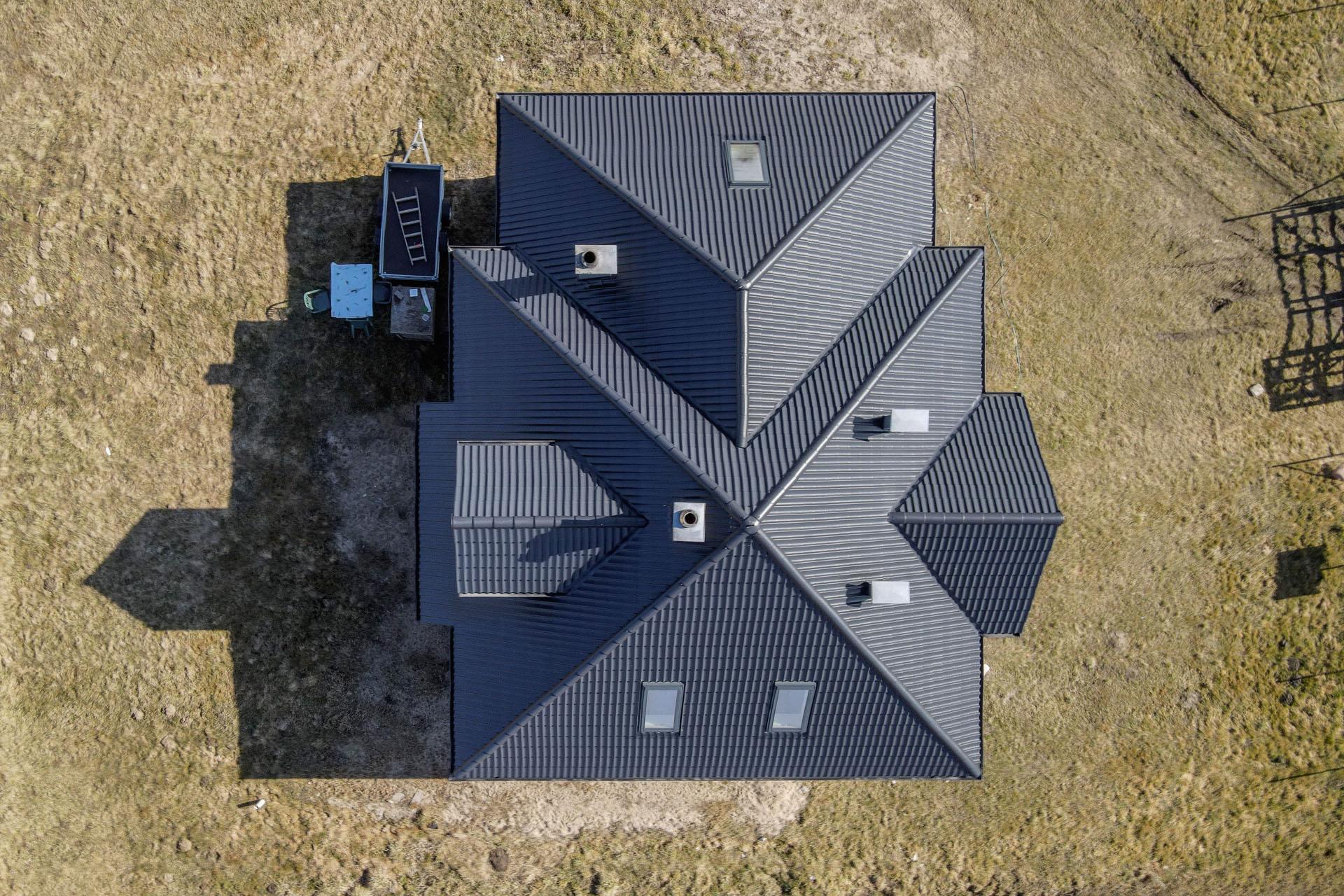 Dach wielospadowy, pokryty trwałą dachówką, strop wylewany.