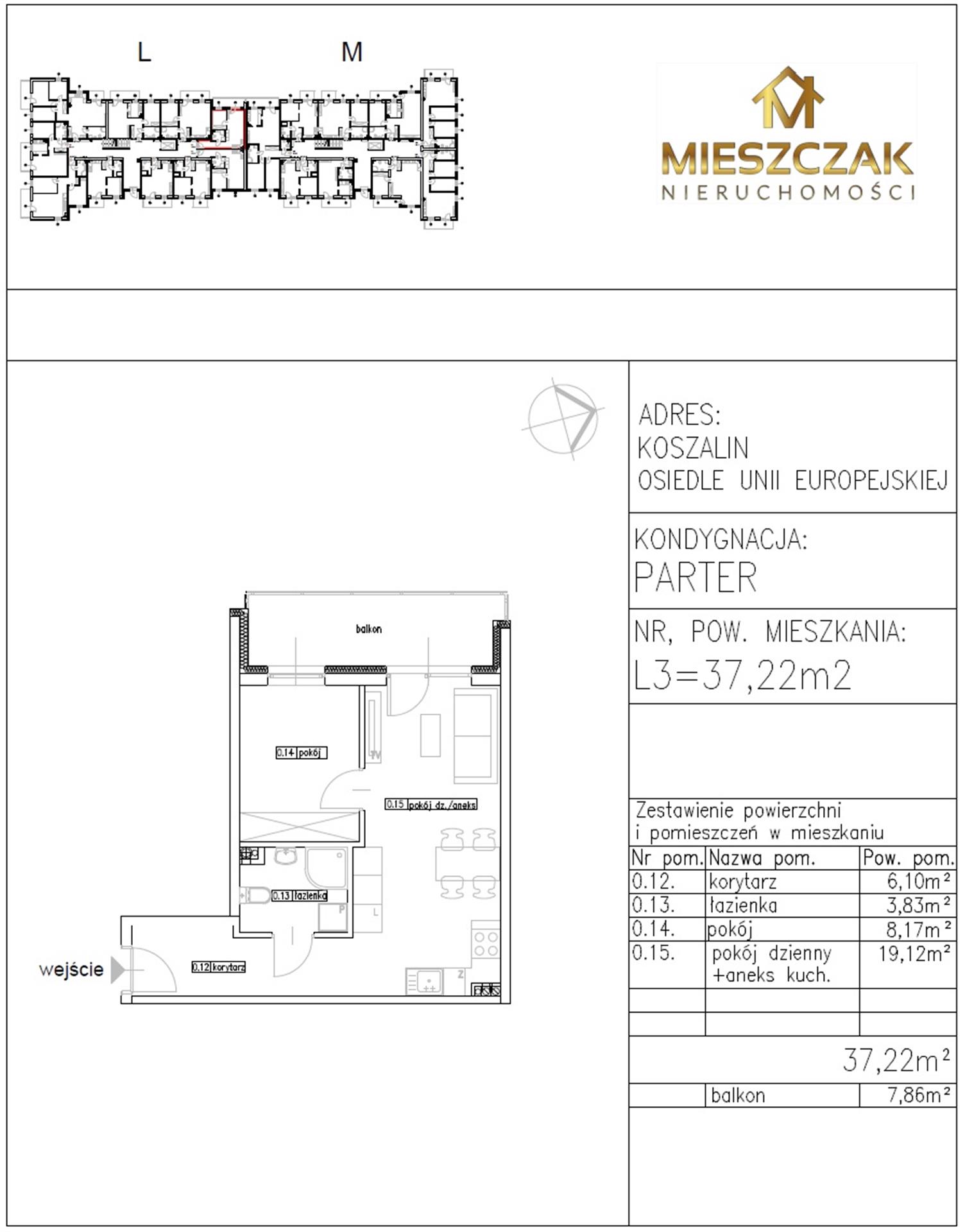 Nowoczesny dwupokojowy apartament (L3) o powierzchni 37,22 m2 położony na parterze w nowoczesnym 4-piętrowym budynku. Składa się z: