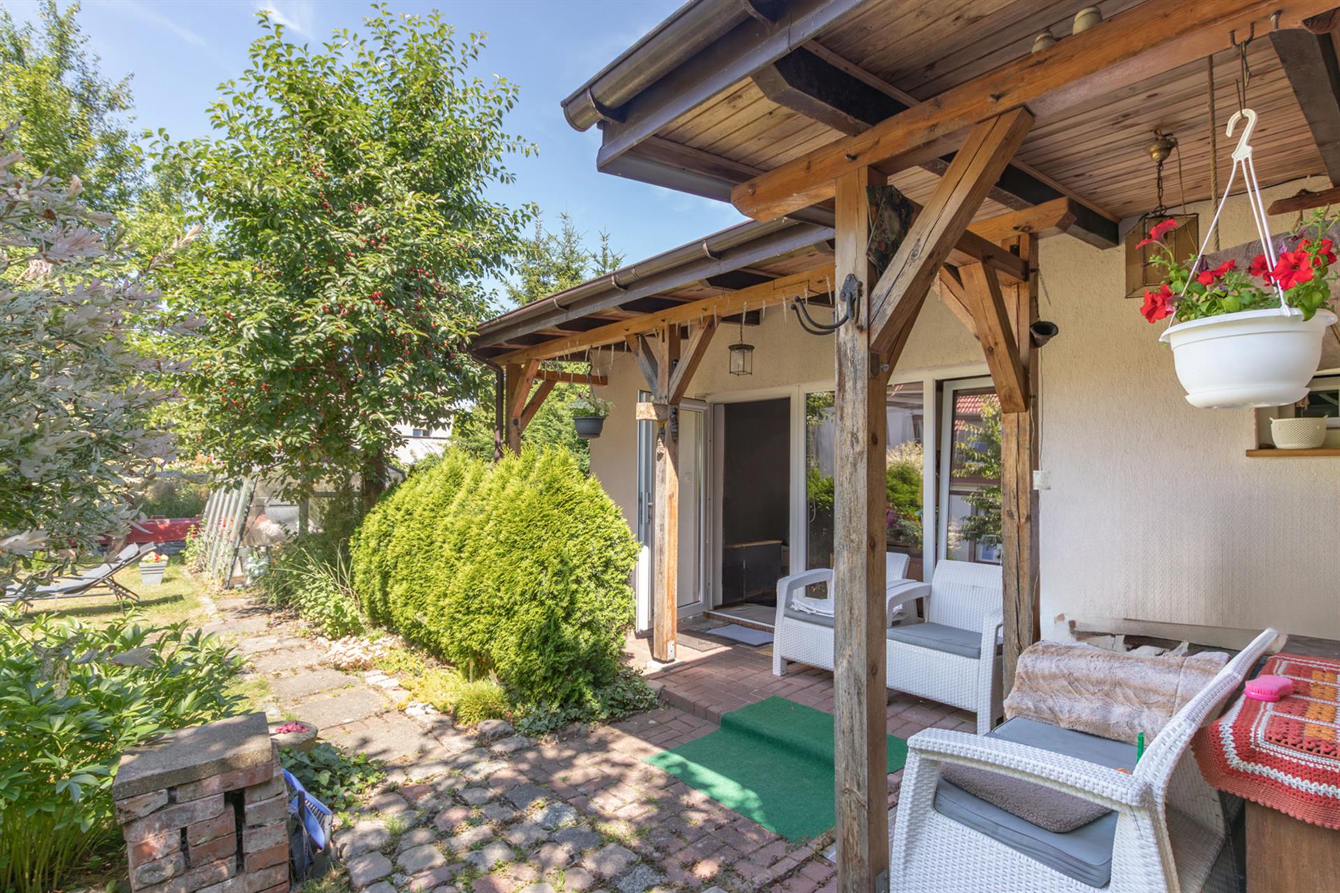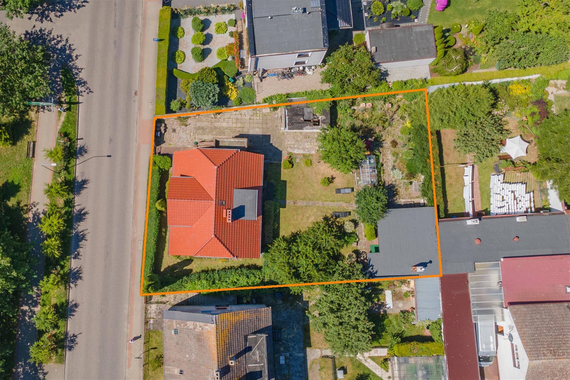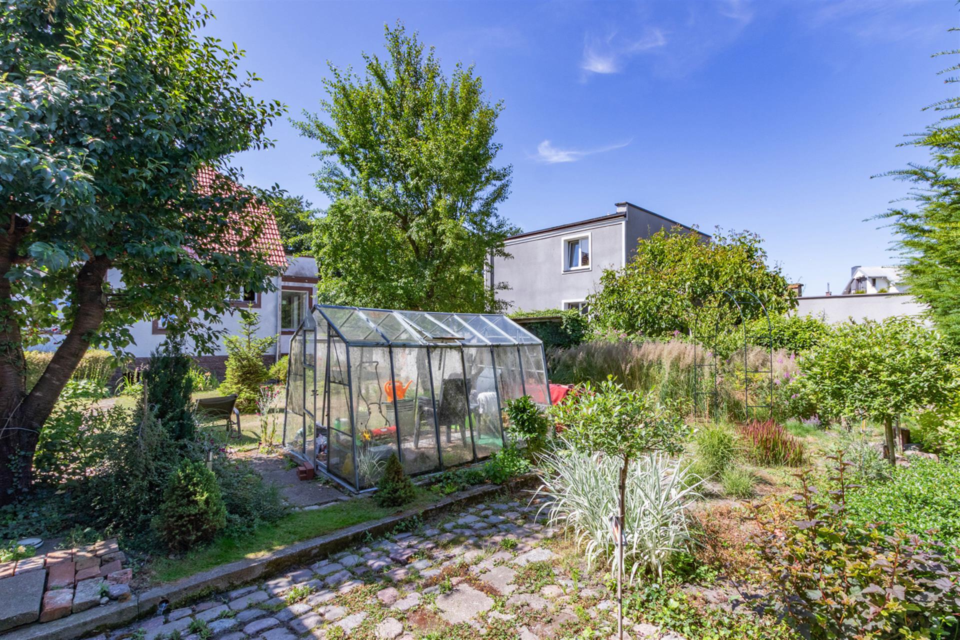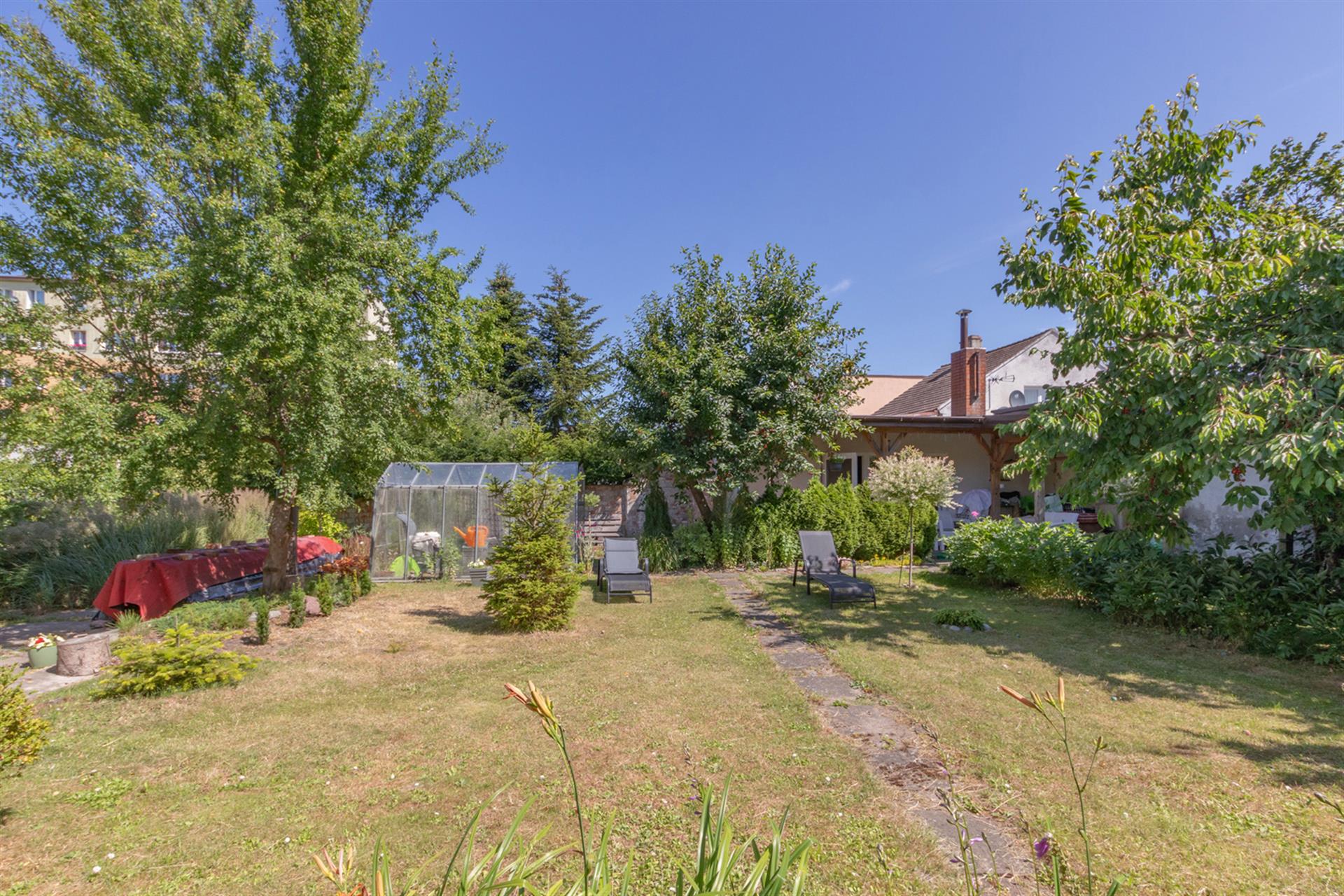 Działka o pow. 653 m2, ogrodzona i zagospodarowana (trawniki, nasadzenia, szklarnia, parking).