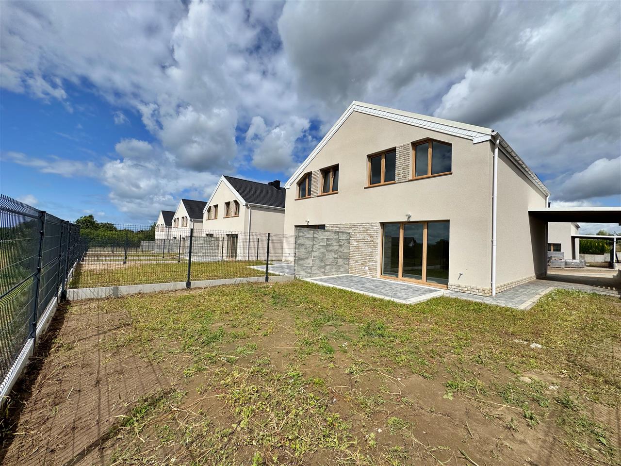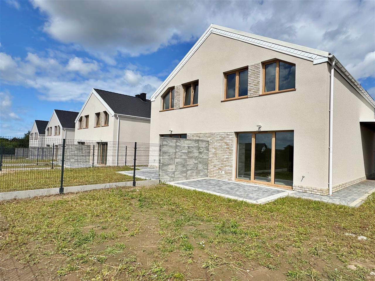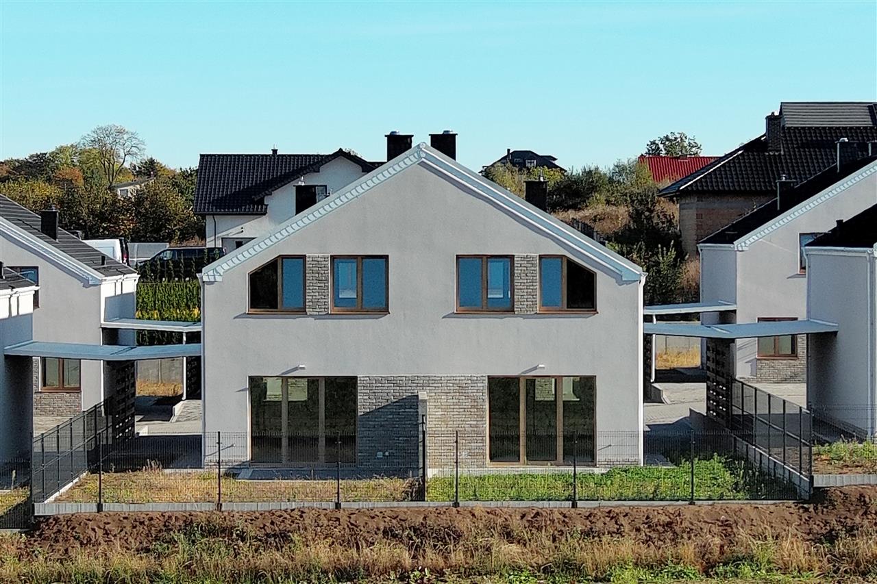 Wykończenie w standardzie developerskim – idealne dla osób, które chcą stworzyć wnętrza dopasowane do własnego gustu: tynki maszynowe, wtyczki, kontakty, ogrzewanie indywidualne gazowe- podłogowe firmy Tece wraz z piecem 2-funkcyjnym 24 kW firmy DE Dietrich ze sterownikiem. Dodatkowo w łazience i wc na parterze kaloryfer – drabinka. Stolarka okienna firmy Veka w kolorze Dąb WOODEC TURNER strona zewnętrzna, od wewnątrz w kolorze białym. Rozprowadzona instalacja do podłączenia urządzeń. Instalacja RTV - w każdym pokoju gniazdko RTV. Wykonane podejście do kominka. Dach: dachówka cementowa. Drzwi wejściowe antywłamaniowe. Schody wewnętrzne wylewane betonowe. Dojście do budynku oraz teren przed nim wyłożony kostką polbrukową lub ażurową. Brama wjazdowa (szlaban) na pilota. Wydzielone ogródki (określony sposób do korzystania). Budynek niepodpiwniczony.