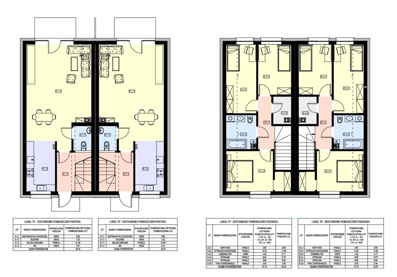 PIĘTRO (pow.: 37,75 m2, po podłodze: 42,35 m2): korytarz (3,89 m2), pokoje: (10,45 m2, 8,25 m2, 8,66 m2), łazianka z wc (4,22 m2), pomieszczenie gospodarcze (2,28m2).