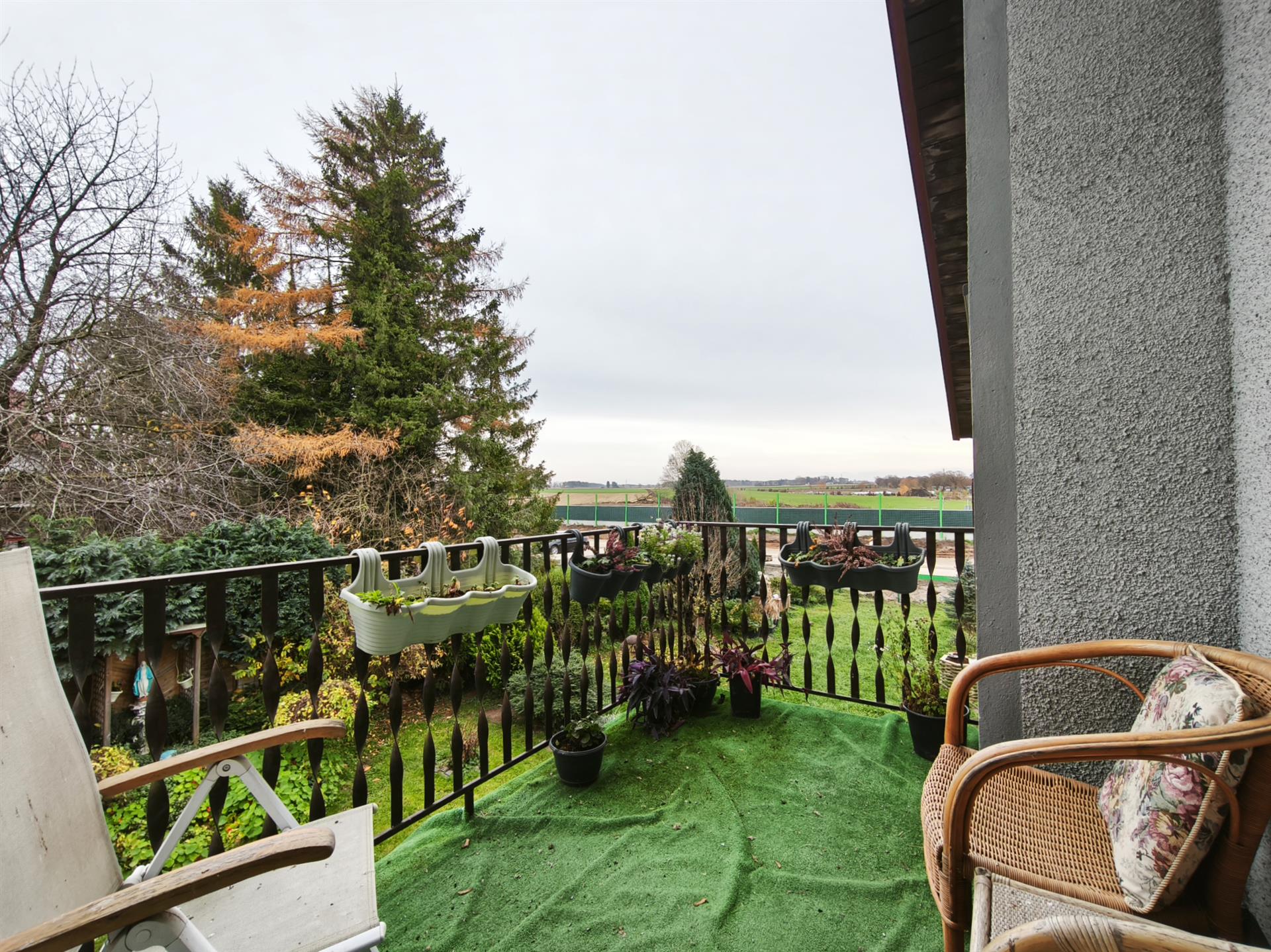 Na działce posadzone są liczne rośliny i nasadzenia tworzące piękną, zieloną ozdobę otoczenia. Zewnętrzny zadaszony taras to idealne miejsce na spędzanie wolnego czasu na świeżym powietrzu.