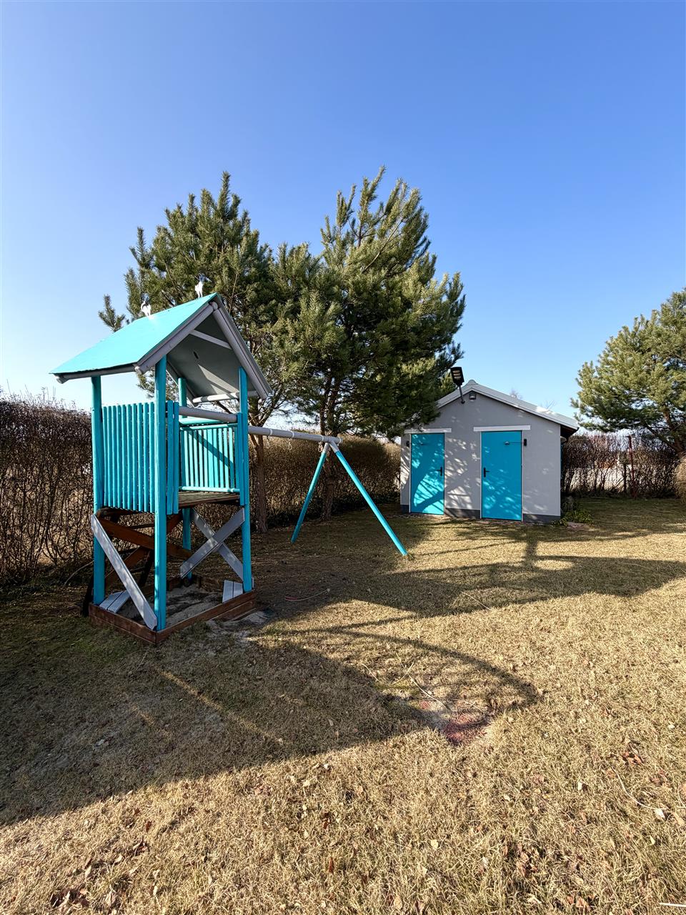 Teren: w całości ogrodzony i zagospodarowany (plac zabaw, dojście do budynków z kostki betonowej)