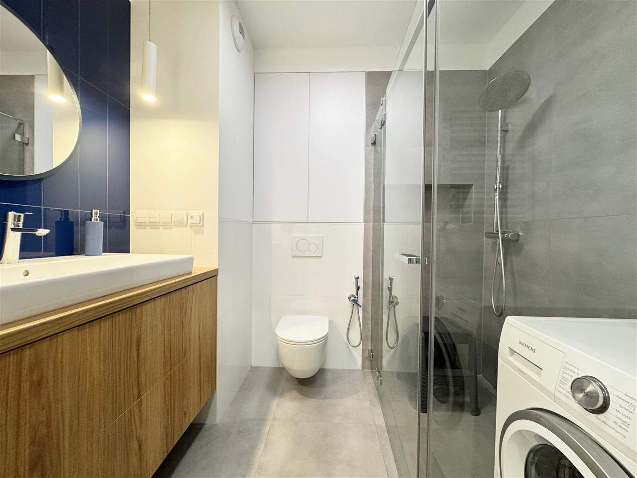 Łazienka połączona z wc: (4,71m2) kabina prysznicowa, umywalka, wc, kran bidetowy.