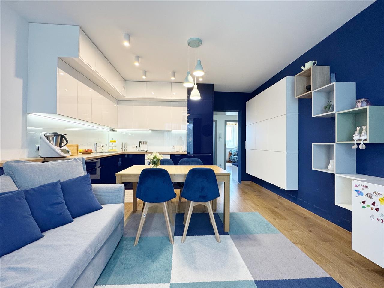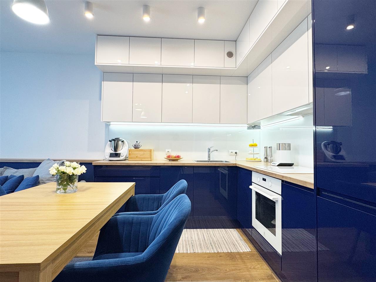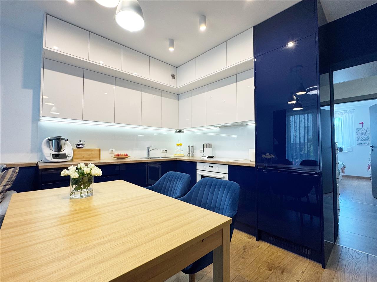 Kuchnia: wyposażona i umeblowana: szafki wiszące i stojące wykonane na wymiar, sprzęt AGD pozostaje na wyposażeniu mieszkania.
