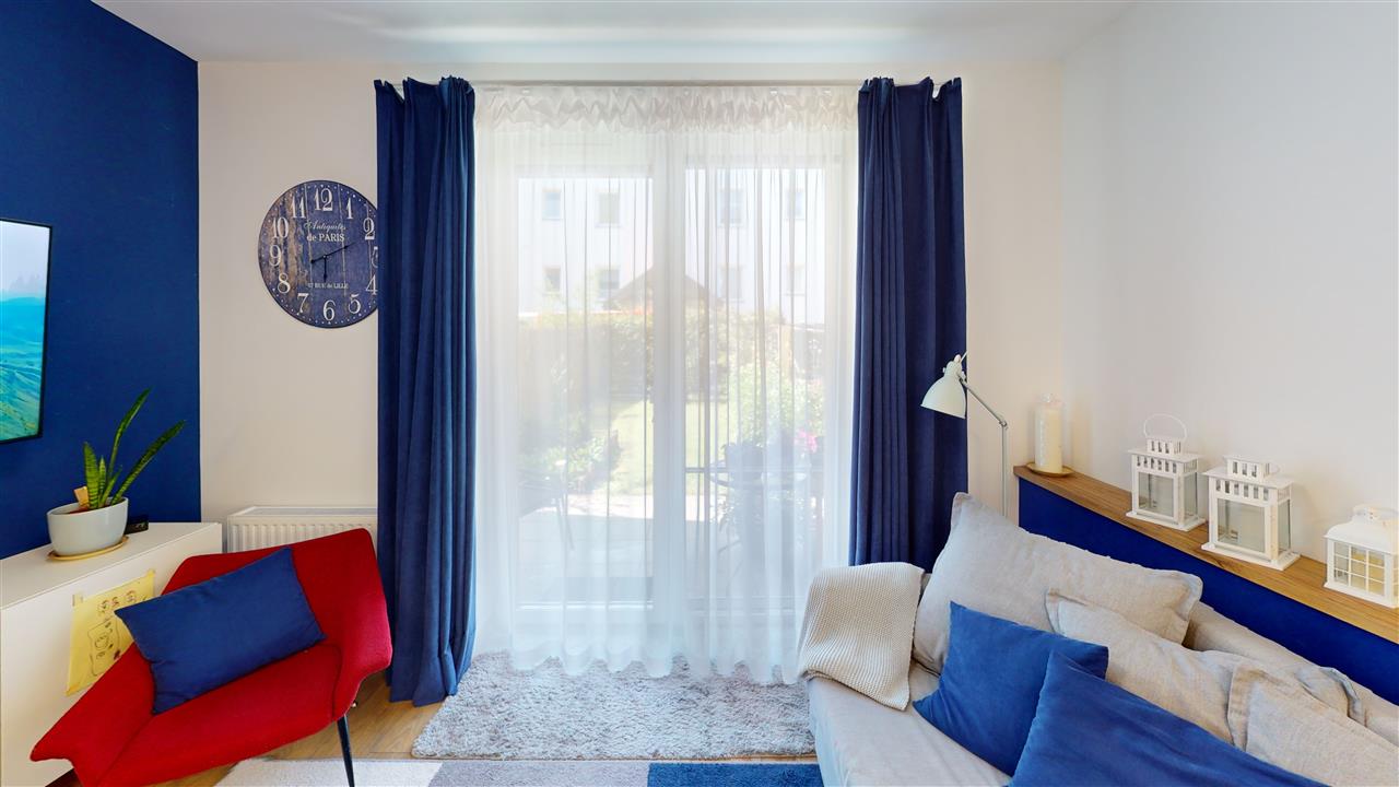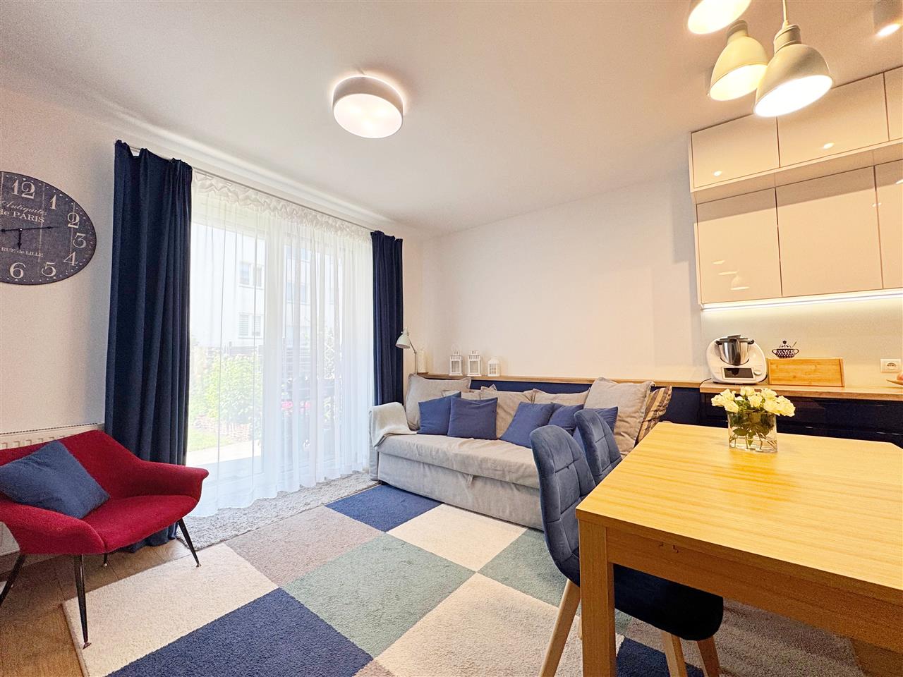 Pokój/Salon połączony z aneksem kuchennym (21,34m2) z wyjściem na taras i ogródek.