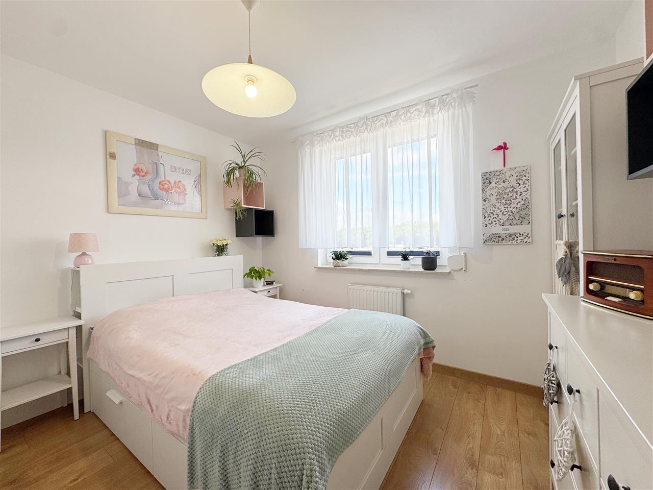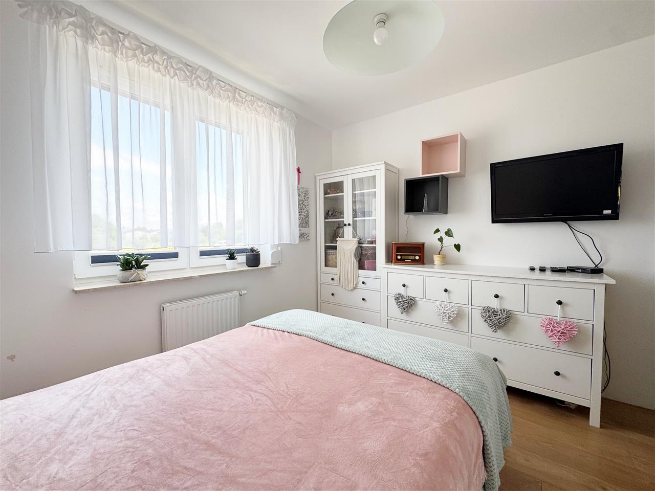 Okna PCV z roletami okiennymi wewnętrznymi oraz w dwóch pokojach rolety zewnętrzne. W oknie balkonowym zamontowana moskitiera. Wystawa okienna wschód-zachód.