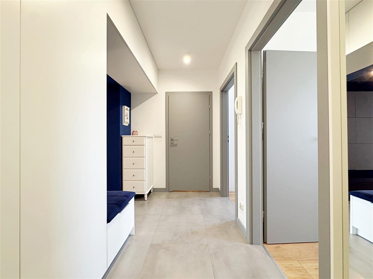 Przedpokój: zabudowa meblowa w postaci szafy, szafek oraz siedziska, drzwi antywłamaniowe.