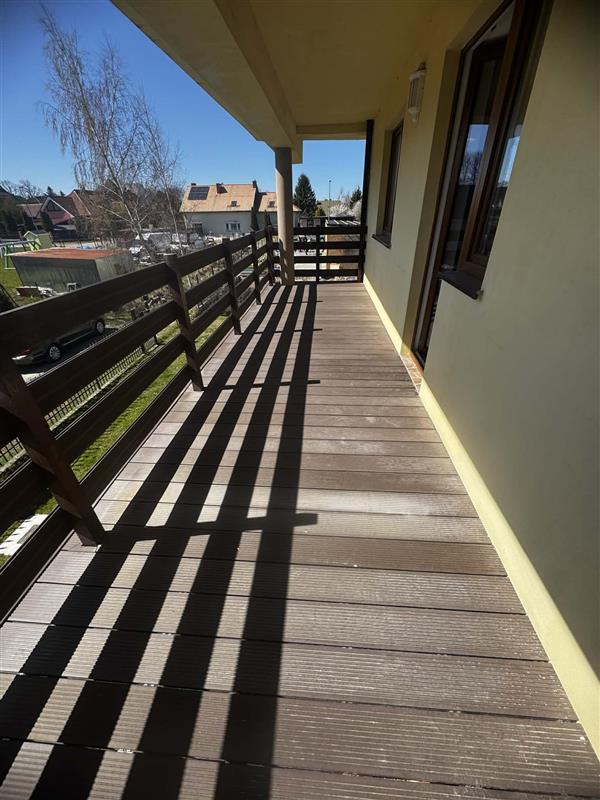 piętro: 3 pokoje z łazienkami, przejście do części z pokojami dla gości: salon z aneksem kuchennym, pomieszczenia gospodarcze pomocnicze.