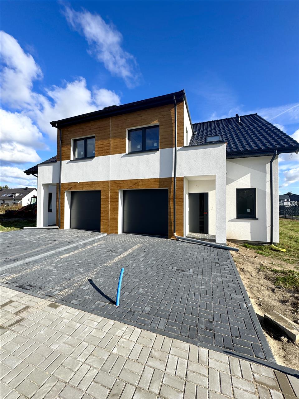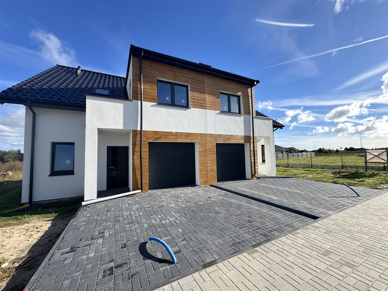 Okna trzy szyby grafitowe montowane w systemie ciepły montaż, dodatkowo zostaną zamontowane termoparapety, drzwi wejściowe Gerda antywłamaniowe grafitowe, brama garażowa z napędem grafitowa, elewacja 15 cm styropianu, dachówka ceramiczna, wewnątrz tynki gipsowe, posadzka na gruncie betonowa w tym styropian 15 cm, piec gazowy jednofunkcyjny z zasobnikiem, wykonanie instalacji elektrycznej wewnątrz budynku oraz instalacji alarmowej i pod monitoring, na posesji kostka polbrukowa w kolorze grafitowym.