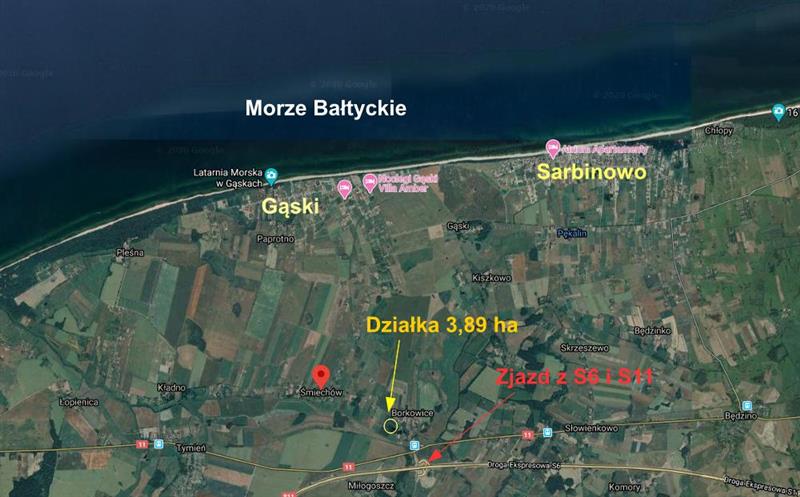 Zdecydowany atut tej działki to jej położenie w pobliżu zjazdu z drogi S6 i S11. Cały ruch turystyczny w kierunku Gąsek i Pleśnej odbywa się przy naszej działce. Choć do zjazdy z drogi szybkiego ruchu jest blisko to jest on jednak w ogóle niesłyszalny ponieważ S6 na tym odcinku biegnie w zagłębieniu ziemi.