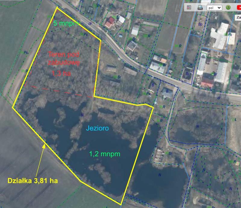 Bonitacja: na około 25 arach jest ziemia klasy PSV a reszta to N czyli nieużytek. Przepięknie położona nieruchomość będąca pozostałością po kopalni żwiru. Teren jest nachylony w kierunku południowym a w jeziorze jest krystalicznie czysta woda (prawdopodobnie zasilania podziemnym źródłem). Jezioro stanowi siedlisko ryb oraz licznych gatunków ptaków, żab itp. Dojazd do działki drogą asfaltową.