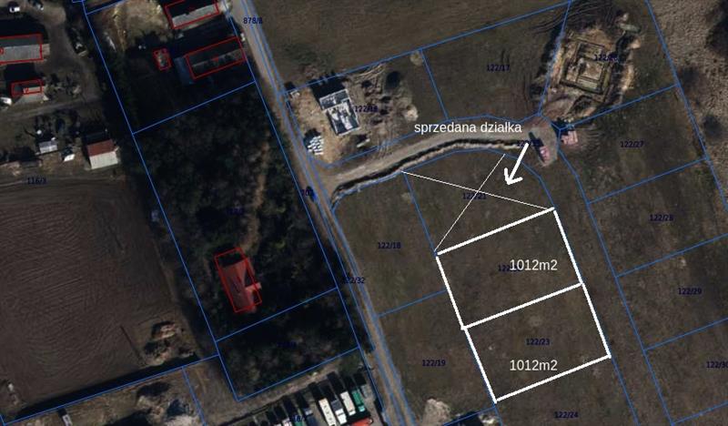 Działki o nr 122/22 i 122/23 powierzchniach kolejno: 1012m2 i 1012m2.Drogi dojazdowe wewnętrzne- udział.Cena dotyczy jednej działki. Klasa gruntu - RIVa i RIVb.